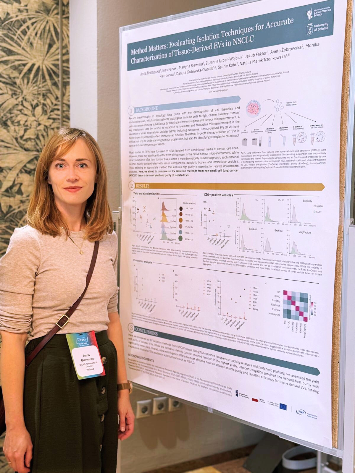 - Katarzyna Dziubek (“Mass Spectrometry-Based Mapping of the PD-1 Interactome Reveals Cross-Species Therapeutic Targets”) and Anna Biernacka (“Method Matters: Evaluating Isolation Techniques for Accurate Characterization of Tissue-Derived EVs in NSCLC”) presented posters under the SWIFT project (Science for Welfare, Innovations and Forceful Therapies), showcasing novel immunological approaches in NSCLC research.