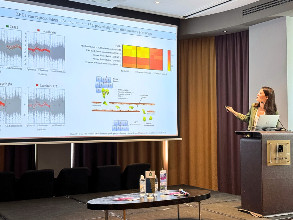 Ines Papak presented the talk “From One Cell to a Tumor: The Story of CD45⁺ Cells in NSCLC”, offering new insights into the role of immune cells in NSCLC progression. She highlighted that the tumor microenvironment exhibits high cellular heterogeneity, which obscures the molecular mechanisms underlying tumor initiation, metastasis, and immune evasion, and that understanding these processes may open up new therapeutic opportunities.